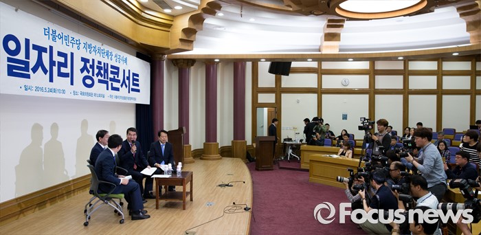 (서울=포커스뉴스) 박원순(왼쪽 두 번째) 서울시장을 비롯한 지자체장들이 24일 오전 서울 여의도 국회의원회관에서 열린 '더불어민주당, 지자체장 초청 일자리 정책 콘서트'에 참석해 토론 하고 있다.
