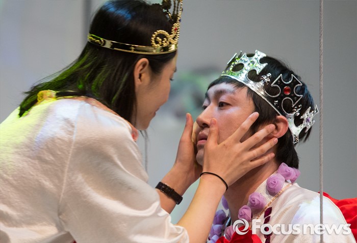 (서울=포커스뉴스) 24일 오후 서울 종로구 CJ아지트 대학로점에서 열린 연극 '크레센도 궁전' 프레스콜에 참여한 배우 김소진(왼쪽)과 권일이 주요장면을 시연하고 있다.