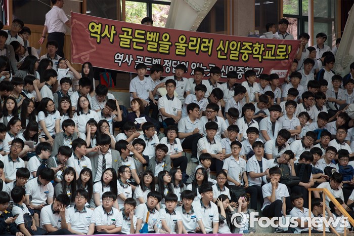 (서울=포커스뉴스) 24일 오후 서울 강북구 신일중학교 체육관에서 열린 근현대사기념관 개관 기념 '역사 골든벨'에 참석한 학생들이 예선전 O.X 퀴즈 풀기 전 자리에 앉아 있다.