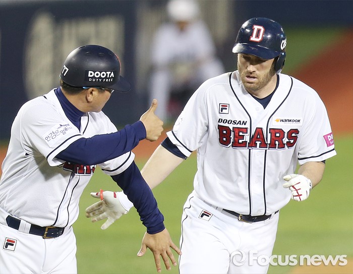 (서울=포커스뉴스) 24일 서울 잠실구장에서 열린 2016프로야구 kt-두산 경기 4회말 2사 3루에서 두산 에반스가 중월 2점 홈런을 치고 3루를 돌며 전형도 코치의 환영을 받고 있다.