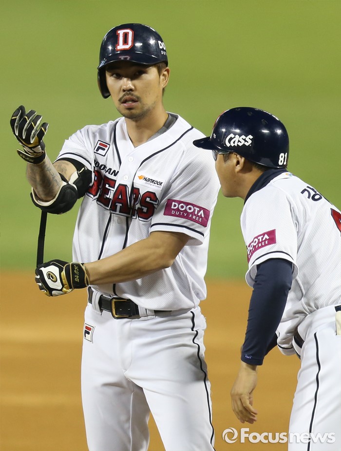 (서울=포커스뉴스) 24일 서울 잠실구장에서 열린 2016프로야구 kt-두산 경기 7회말 무사 만루에서 두산 오재원이 동점 2타점 중전 안타를 치고 1루에서 강동우 코치의 축하를 받고 있다.