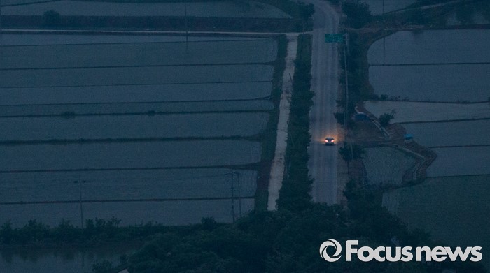 (철원=포커스뉴스) 입하와 소만을 지나 망종으로 향하는 24일 오후 강원도 철원 소이산 전망대에서 바라본 어둑한 철원평야의 논둑길 사이로 자동차가 지나가고 있다.