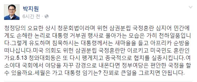 한편 지난 19일 국회 본회의를 통과한 국회법 개정안은 23일 정부로 이송됐다. 헌법 제53조에 따르면 국회에서 의결된 법률안은 정부에 이송 된 15일 이내 대통령이 공포하도록 명시하고 있다.<사진출처=박지원 페이스북>