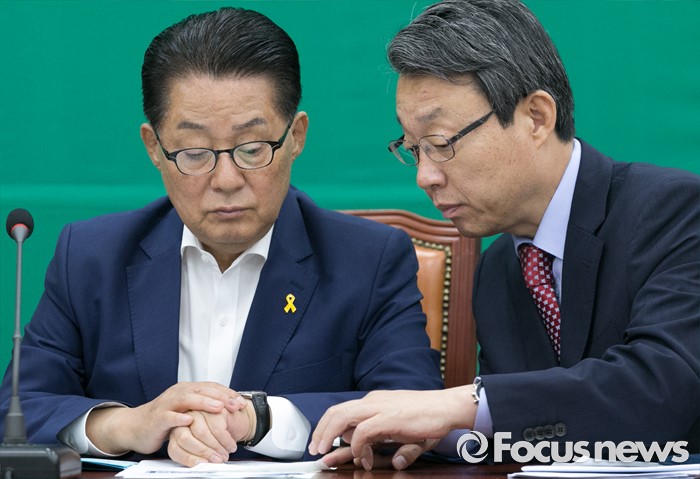 (서울=포커스뉴스) 25일 오전 서울 여의도 국회에서 열린 국민의당 최고위원회의에 참석한 박지원(왼쪽) 원내대표와 김성식 정책위의장이 대화하고 있다.