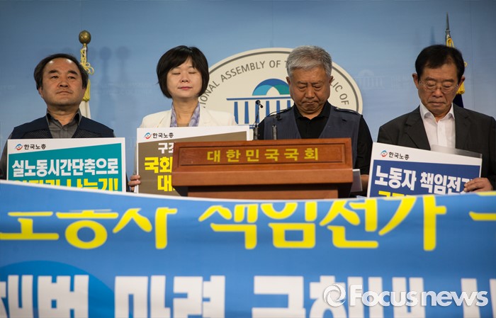 (서울=포커스뉴스) 이용득(오른쪽) 더불어민주당 당선자와 이정미(왼쪽 두번째) 정의당 국회의원 당선자가 25일 오전 서울 여의도 국회에서 김동만(오른쪽 두번째) 한국노총 위원장과 함께 '구조조정 해법 마련 국회 내 사회적 대화 촉구 기자회견'을 하고 있다.