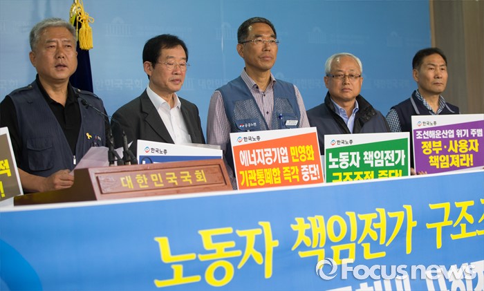 (서울=포커스뉴스) 김동만(왼쪽 첫번째) 한국노총 위원장이 25일 오전 서울 여의도 국회에서 열린 '구조조정 해법 마련 국회 내 사회적 대화 촉구 기자회견'에서 발언하고 있다. 왼쪽 두번째 이용득 더불어민주당 국회의원 당선인