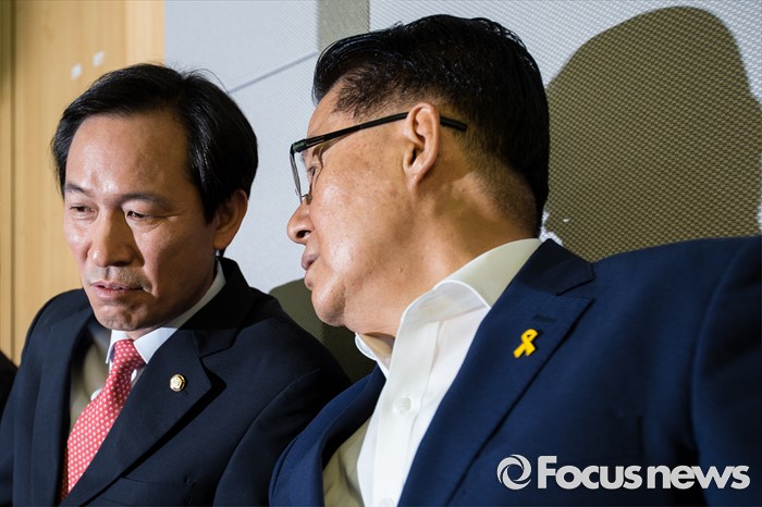 (서울=포커스뉴스) 우상호(오른쪽 두 번째) 더불어민주당 원내대표와 박지원 국민의당 원내대표가 25일 오전 서울 여의도 국회의원회관에서 열린 '공영언론 지배구조 개선 위한 20대 국회의 역할과 과제 토론회'에 참석해 대화를 나누고 있다.