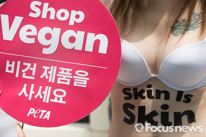 (서울=포커스뉴스) 25일 오후 서울 강남구 프라다매장 앞에서 동물보호단체 케어 관계자들이 프라다 타조 가방에 반대하는 퍼포먼스를 펼치고 있다.