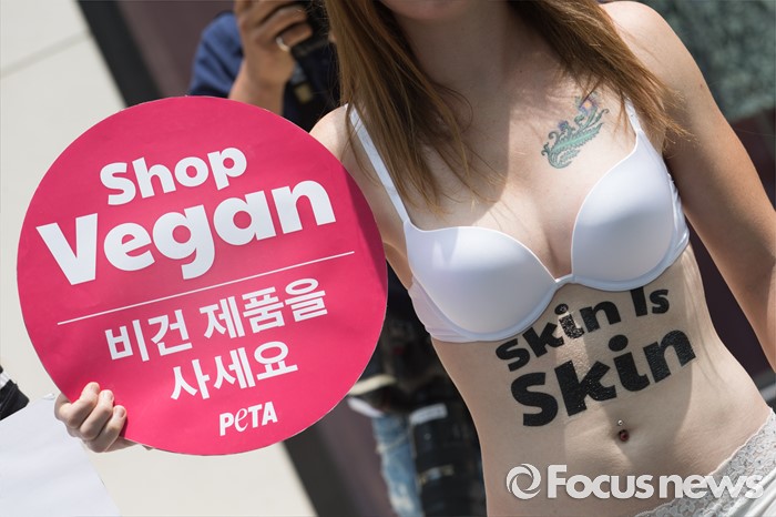 (서울=포커스뉴스) 25일 오후 서울 강남구 프라다매장 앞에서 동물보호단체 케어 관계자들이 프라다 타조 가방에 반대하는 퍼포먼스를 펼치고 있다.