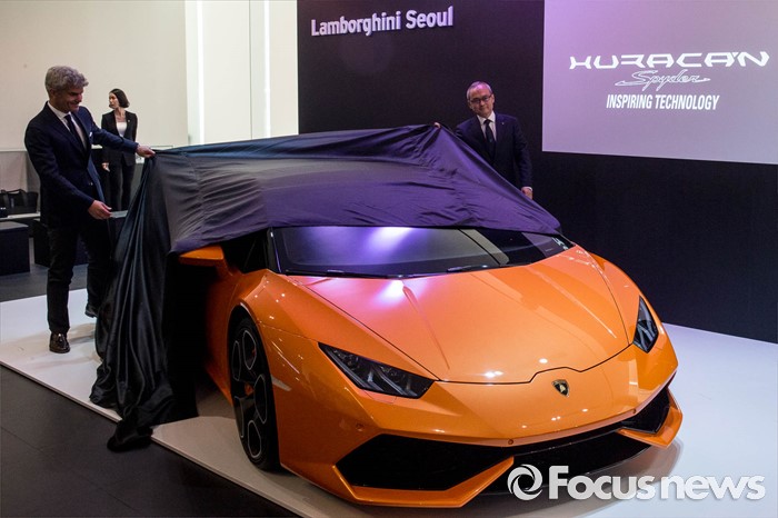 (서울=포커스뉴스) 25일 오전 서울 강남구 람보르기니 서울에서 열린 람보르기니 우라칸 LP 610-4 스파이더 출시 행사에서 업체 관계자들이 차량을 선보이고 있다.