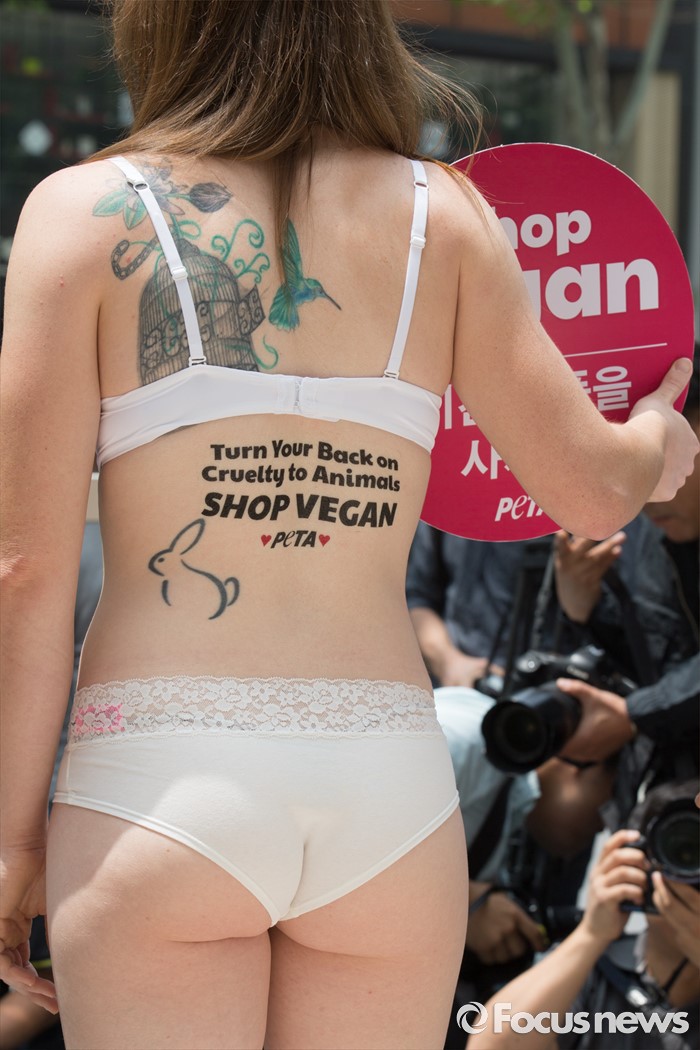 (서울=포커스뉴스) 25일 오후 서울 강남구 프라다매장 앞에서 동물보호단체 케어 관계자들이 프라다 타조 가방에 반대하는 퍼포먼스를 펼치고 있다.