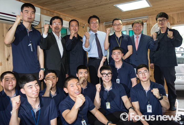 (서울=포커스뉴스) 정진석 새누리당 원내대표가 25일 오후 서울 여의도 새누리당 당사에서 당사 경비 및 의경들을 격려한 후 기념사진을 찍고 있다.