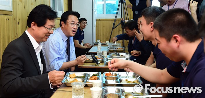 (서울=포커스뉴스) 정진석 새누리당 원내대표가 25일 오후 서울 여의도 당사 앞 경비 의경대를 방문해 식사를 하며 의경들을 격려하고 있다.