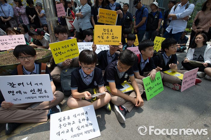 (서울=포커스뉴스) 25일 오전 서울 종로구 옛 일본대사관 앞에서 열린 '제1232차 일본군 위안부 문제해결을 위한 정기 수요시위'에 참석한 학생들이 피켓을 들고 있다.