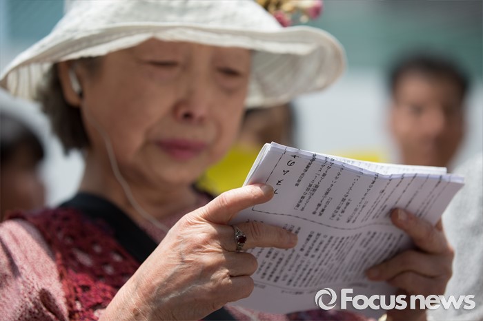 (서울=포커스뉴스) 25일 오전 서울 종로구 옛 일본대사관 앞에서 열린 '제1232차 일본군 위안부 문제해결을 위한 정기 수요시위'에 참석한 일본인들이 아침이슬을 합창하고 있다.