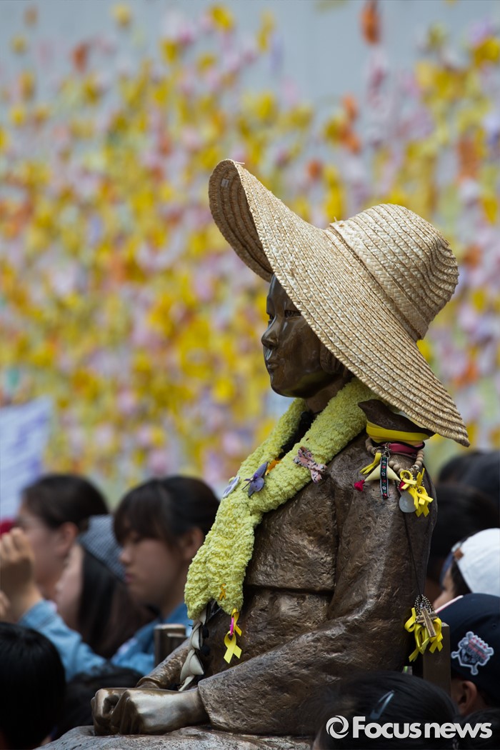 | △ 정기 수요시위, 밀집모자 쓴 소녀상 |