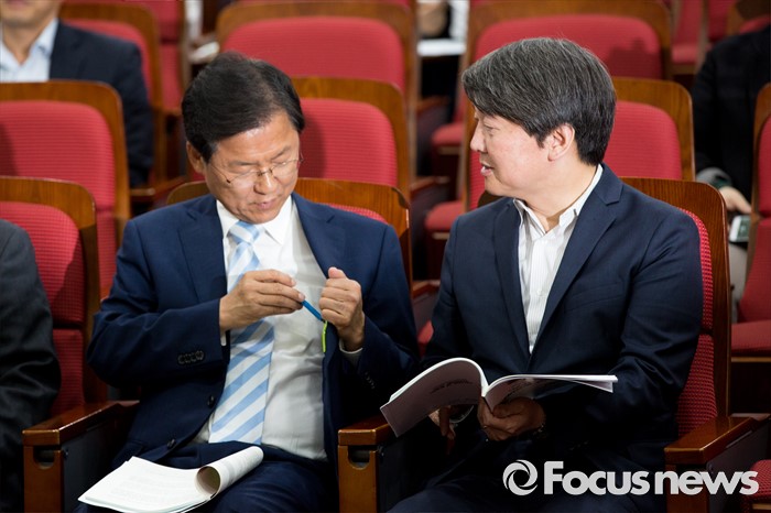 (서울=포커스뉴스) 안철수(오른쪽) 국민의당 상임공동대표와 천정배 국민의당 공동대표가 25일 오후 서울 여의도 국회의원회관에서 열린 '제조물 책임법 문제점 개선방안 토론회'에 참석해 대화를 나누고 있다.