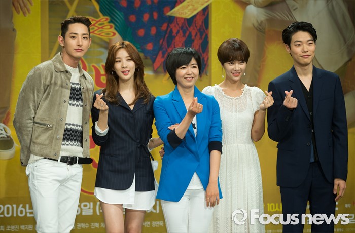 (서울=포커스뉴스) 25일 오후 서울 마포구 MBC상암사옥에서 열린 MBC 수목드라마 '운빨로맨스' 제작발표회에 참석한 배우 이수혁(왼쪽부터), 이청아, 김경희 PD, 황정음, 류준열이 포토타임을 갖고 있다.