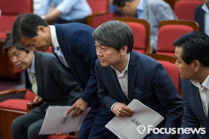 (서울=포커스뉴스) 안철수(오른쪽 두 번째) 국민의당 상임공동대표와 천정배(오른쪽 두 번째) 국민의당 공동대표가 25일 오후 서울 여의도 국회의원회관에서 열린 '제조물 책임법 문제점 개선방안 토론회'에 참석해 국민의례를 마친 뒤 자리에 앉고 있따.