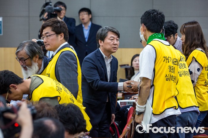 (서울=포커스뉴스) 안철수 국민의당 상임공동대표가 25일 오후 서울 여의도 국회의원회관에서 열린 '제조물 책임법 문제점 개선방안 토론회'에 참석한 가습기 살균제 피해 가족들과 인사 하고 있다.