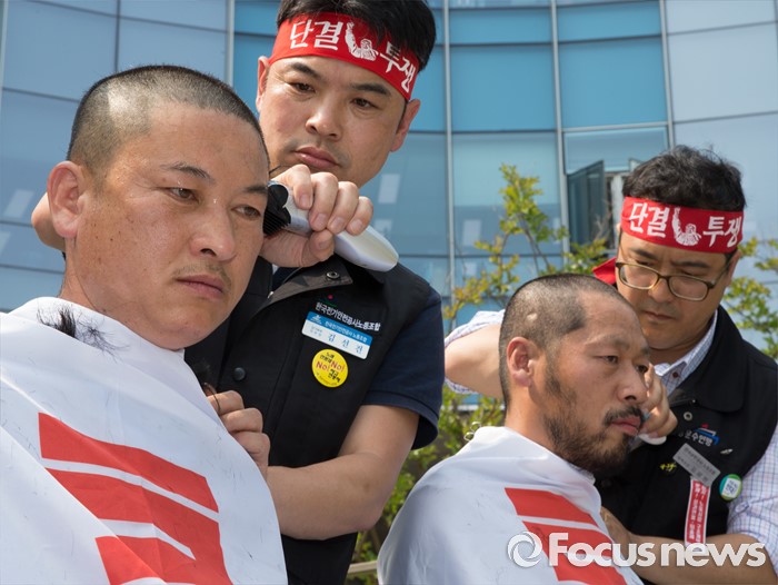 (세종=포커스뉴스) 25일 오후 세종시 정부세종청사 기획재정부 앞에서 공기업정책연대 구성원들이 성과연봉제 저지 및 강제퇴출제 반대 수요집회에서 삭발식을 하고 있다.