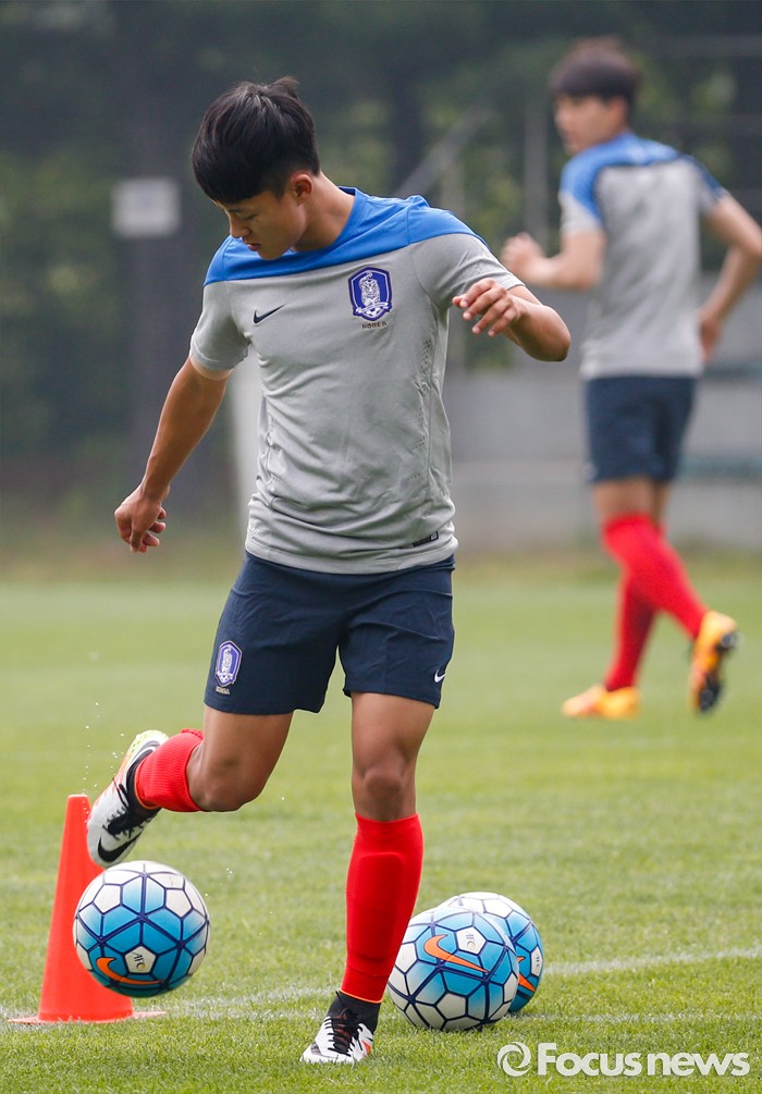 (파주=포커스뉴스) 이승우(18, 바르셀로나 후베닐A)가 25일 오후 경기도 파주 NFC에서 잉글랜드 U18(18세 이하) 대표팀과의 친선전을 앞두고 축구대표팀 선수들과 소집 훈련에 임하고 있다.