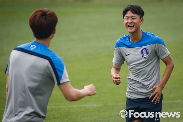 (파주=포커스뉴스) 이승우(18, 바르셀로나 후베닐A)가 25일 오후 경기도 파주 NFC에서 잉글랜드 U18(18세 이하) 대표팀과의 친선전을 앞두고 축구대표팀 선수들과 소집 훈련에 임하고 있다.