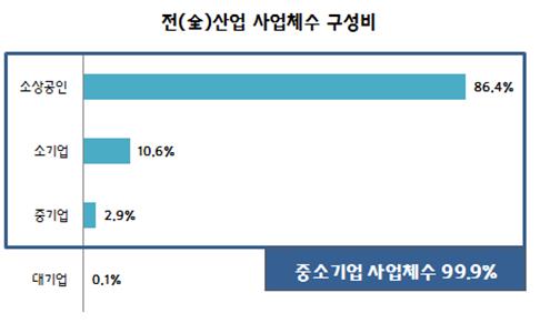소한섭 중기중앙회 경제정책본부장은 "중소기업 고용 비중이 늘고 있는데, 대기업과의 격차가 여전히 지속된다는 것은 그만큼 양극화가 심해짐을 의미한다"며 "양극화 해소와 지속성장을 위해선 시장의 공정성 회복과 자원(금융, 인력)의 합리적 배분을 통해, 성장과 분배가 조화를 이루는 바른 시장경제 구조로의 전환이 필요하다"고 밝혔다.전 산업 사업체수 구성비.<자료제공=중기중앙회>전 산업 종사자수 구성비.<자료제공=중기중앙회>