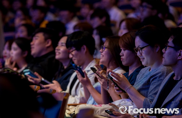 (서울=포커스뉴스) 25일 오후 서울 서대문구 연세대학교에서 열린 삼성 퀴즈 콘서트 '청춘門답'에 참석한 학생들이 휴대전화로 문제를 풀고 있다.