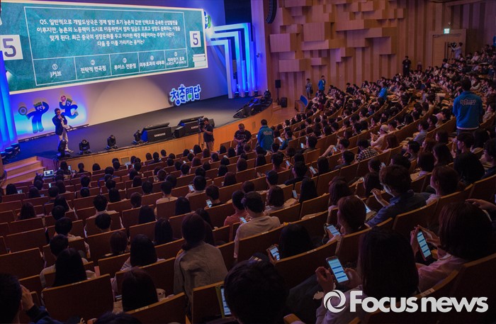(서울=포커스뉴스) 25일 오후 서울 서대문구 연세대학교에서 열린 삼성 퀴즈 콘서트 '청춘門답'에 참석한 학생들이 휴대전화로 문제를 풀고 있다.
