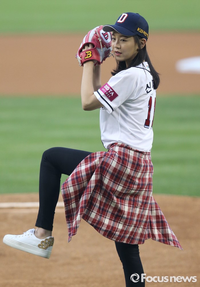 (서울=포커스뉴스) 25일 서울 잠실구장에서 열린 2016 프로야구 kt-두산 경기에 앞서 시구자로 나온 배우 신혜선이 와인드업하고 있다.