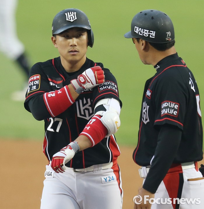 (서울=포커스뉴스) 25일 서울 잠실구장에서 열린 2016프로야구 kt-두산 경기 1회초 무사 2루에서 kt 오정복이 주자를 불러 들이는 우전 안타를 치고 1루에서 김민재 코치의 축하를 받고 있다.