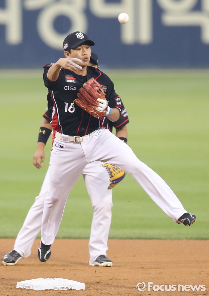 (서울=포커스뉴스) 25일 서울 잠실구장에서 열린 2016프로야구 kt-두산 경기 1회말 무사 1루에서 kt 유격수 박기혁이 두산 민병헌의 타구를 잡아 2루 베이스를 밟은 후 1루로 송구하고 있다. 더블플레이 성공.