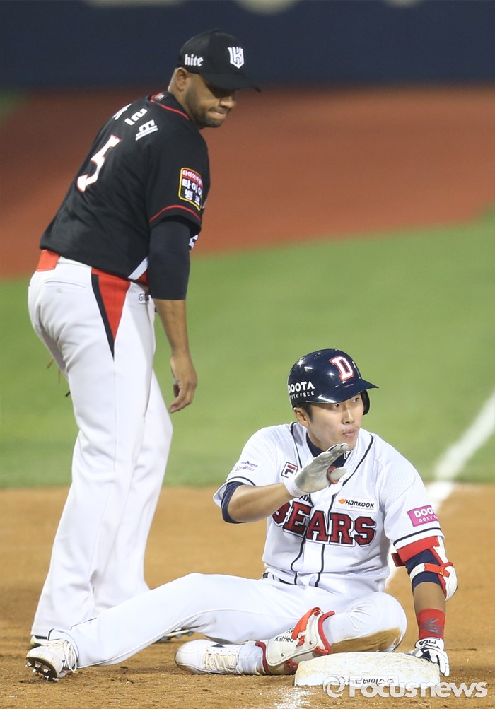 | △ 베이스에 앉아 타임 요청하는 두산 허경민 |