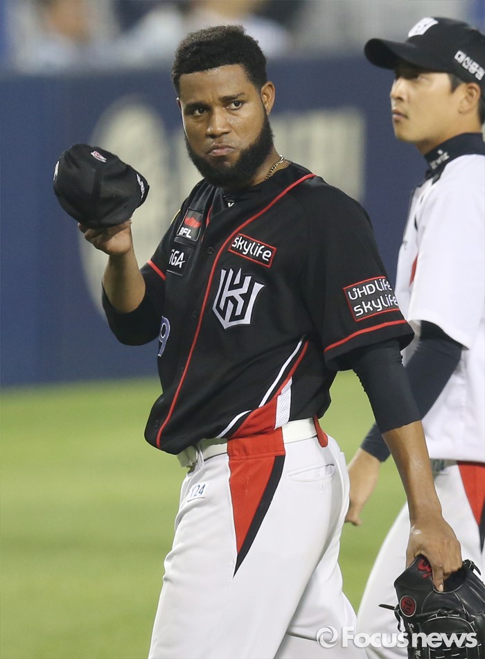 (서울=포커스뉴스) 25일 서울 잠실구장에서 열린 2016프로야구 kt-두산 경기 3회말 무사 2,3루에서 두산 허경민에게 3루타를 맞은 kt 투수 마리몬이 교체돼 덕아웃으로 가며 뒤를 돌아보고 있다.