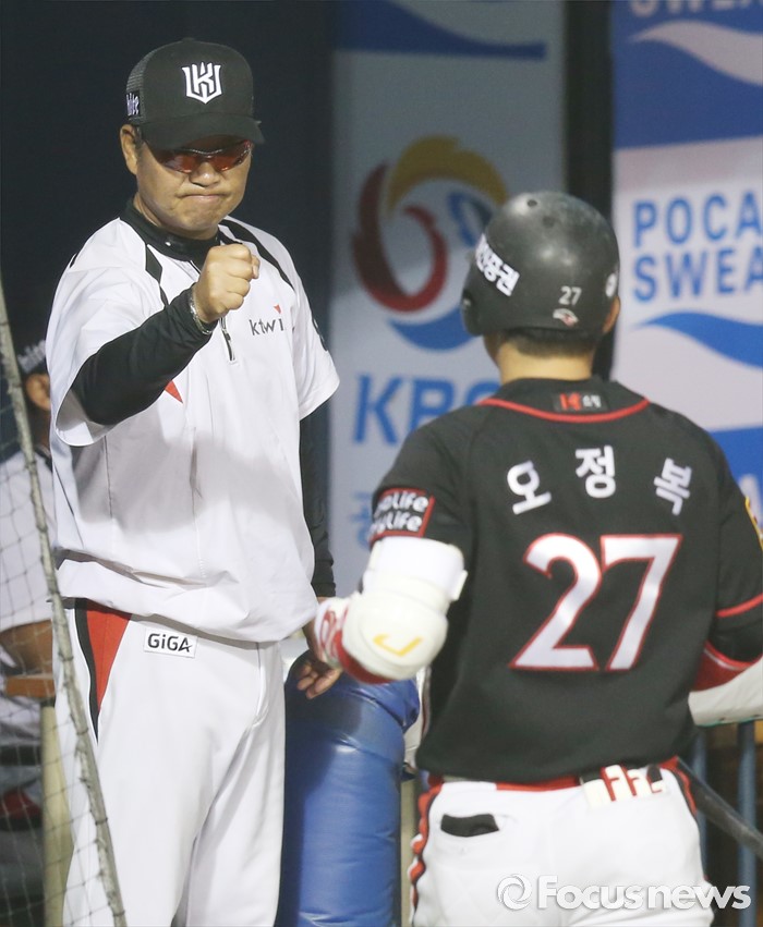 (서울=포커스뉴스) 25일 서울 잠실구장에서 열린 2016프로야구 kt-두산 경기 7회초 kt 오정복이 좌월 솔로 홈런을 치고 덕아웃에서 황병일 코치의 환영을 받고 있다.