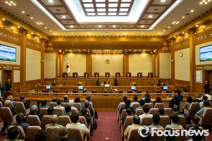 한편, 헌법재판소는 이날 오후 2시 주호영 의원 등이 정의화 국회의장 등을 상대로 청구한 권한쟁의심판을 선고한다.한글을 우리 고유문자로 규정한 현행법이 헌법에 어긋나는지를 판단하는 '국어기본법 제3조' 등에 대한 공개변론이 12일 오후 서울 종로구 헌법재판소 대심판정에서 열렸다. 이날 변론에 참석한 헌법재판관들이 취재진의 퇴장을 기다리고 있다. 2016.05.12 양지웅 기자