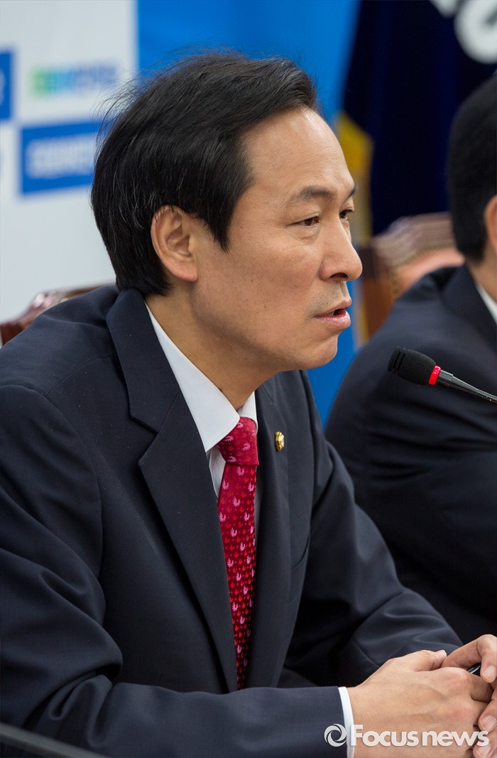 (서울=포커스뉴스) 우상호(왼쪽) 더불어민주당 원내대표가 26일 오전 서울 여의도 국회에서 열린 '청년일자리 TF회의'에 참석해 모두발언 하고 있다.