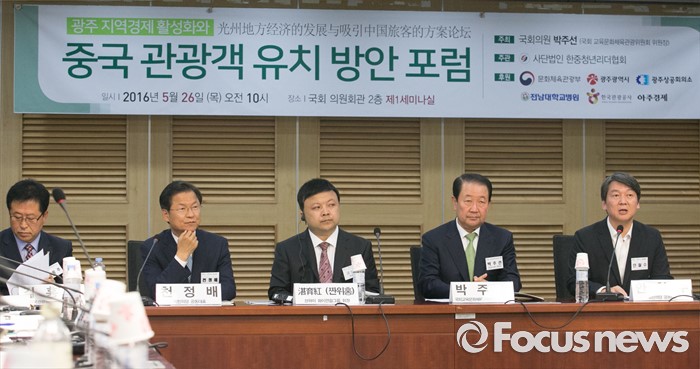 (서울=포커스뉴스) 26일 오전 서울 여의도 국회 의원회관에서 열린 광주 지역경제 활성화와 중국 관광객 유치 방안 포럼에 참석한 안철수(오른쪽 첫번째) 국민의당 상임공동대표가 인사말을 하고 있다.