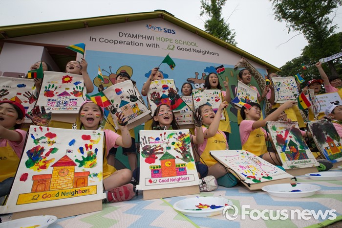 (서울=포커스뉴스) 26일 오전 서울 광진구 어린이대공원에서 열린 굿네이버스 '아프리카 희망학교 체험전'에서 초등학교 학생들이 아프리카에 보낼 가방을 완성한 후 기념촬영을 하고 있다.