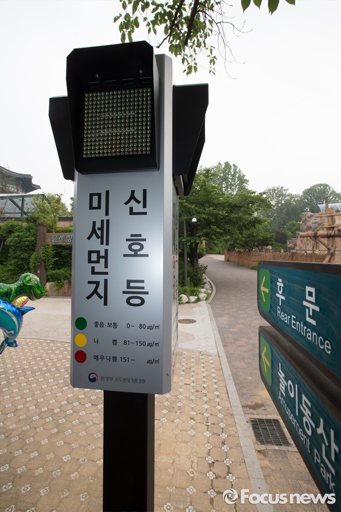 (서울=포커스뉴스) 26일 오전 서울 광진구 어린이대공원에 설치된 미세먼지 신호등에 나쁨 수준인 노란색 불이 켜져 있다.