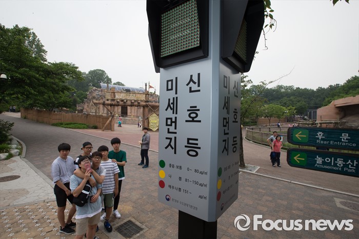 (서울=포커스뉴스) 26일 오전 서울 광진구 어린이대공원에 설치된 미세먼지 신호등에 나쁨 수준인 노란색 불이 켜져 있다.