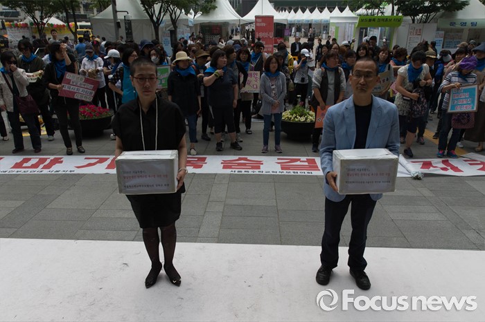 (서울=포커스뉴스) 26일 오전 서울시청 정문앞에서 전국장애인 부모연대와 서울특수학교학부모협의회원들이 발달장애인 정책 수립을 촉구하며 삭발식을 한 뒤 항의의 의미로 머리카락을 서울시에 전달하고 있다.