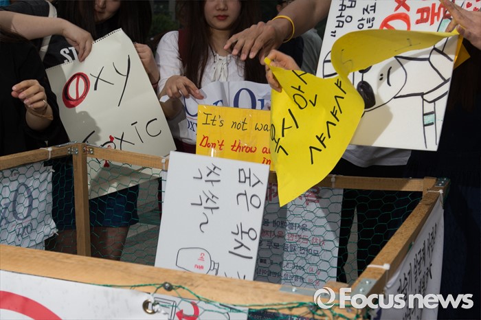 (서울=포커스뉴스) 26일 오후 서울 광화문광장에서 성공회대 학생모임과 청년참여연대 관계자들이 옥시 제품 불매 동참 선언 퍼포먼스를 펼치고 있다.