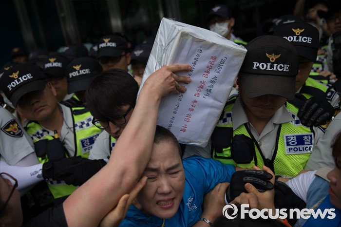 (서울=포커스뉴스) 26일 오전 서울시청 정문앞에서 전국장애인 부모연대와 서울특수학교학부모협의회원들이 발달장애인 정책 수립을 촉구하며 삭발식을 한 뒤 항의의 의미로 머리카락을 서울시에 전달하려고 하자 경찰병력이 막아서고 있다.