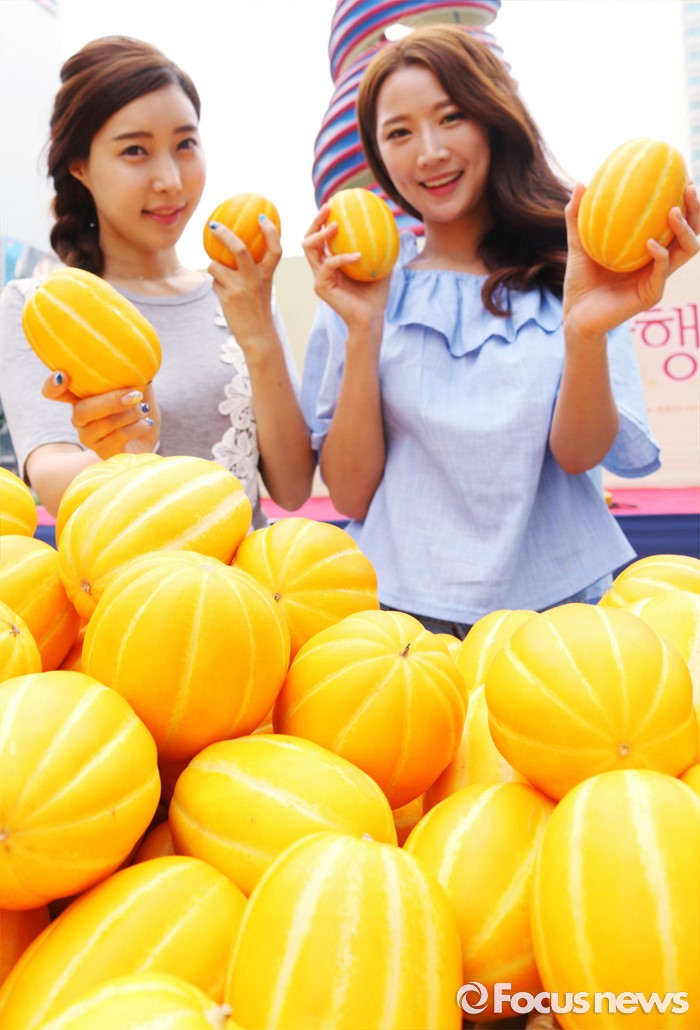26일 서울 청계광장 참외 홍보부스에서 모델들이 참외를 들고, 포즈를 취하고 있다. 농협중앙회는 오는 29일까지 농협에서 운영하는 ‘농협a마켓’을 통해, 참외 3kg을 기존 1만5000원에서 1만원으로 최대 33% 할인 된 가격에 판매한다고 밝혔다.<사진제공=농협>