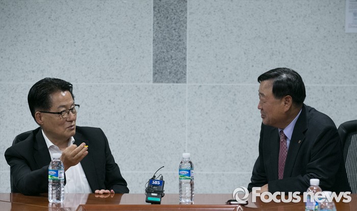 (서울=포커스뉴스) 박지원(왼쪽) 국민의당 원내대표가 26일 오후 서울 여의도 국회 의원회관에서 이희범 평창동계올림픽 조직위원장과 만나 면담을 하고 있다.