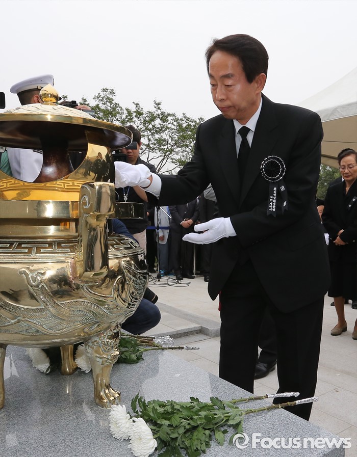 (서울=포커스뉴스)26일 오후 서울 동작구 국립현충원에서 열린 고 김영삼 전 대통령 묘비 제막식에서 고 김 전 대통령의 차남 김현철 교수와 가족들이 헌화 및 분향을 하고 있다.