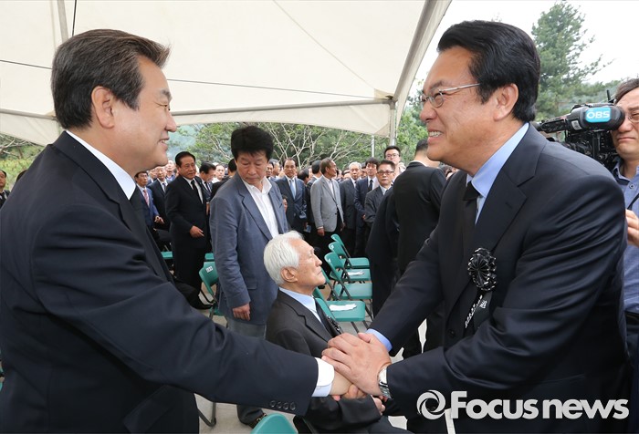 (서울=포커스뉴스)26일 오후 서울 동작구 국립현충원에서 열린 고 김영삼 전 대통령 묘비 제막식에서 김무성(오른쪽) 전 새누리당 대표가 정진석 새누리당 원내대표와 인사를 나누고 있다.