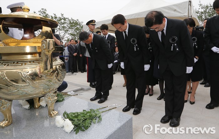 (서울=포커스뉴스) 26일 오후 서울 동작구 국립현충원에서 열린 고 김영삼 전 대통령 묘비 제막식에서 고 김 전 대통령의 차남 김현철 교수와 가족들이 헌화 및 분향을 하고 있다.
